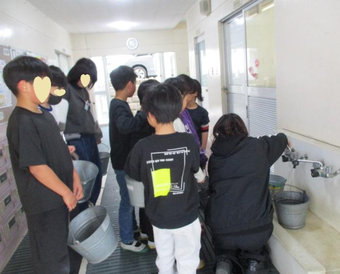 | 普段は冷たく感じる靴箱の掃除も、お湯のおかげで隅々まで力が入ります。寒さに負けず、自分たちの学び舎を一生懸命に美しくする、頼もしい子どもたちの姿が見られたひとときでした。 |