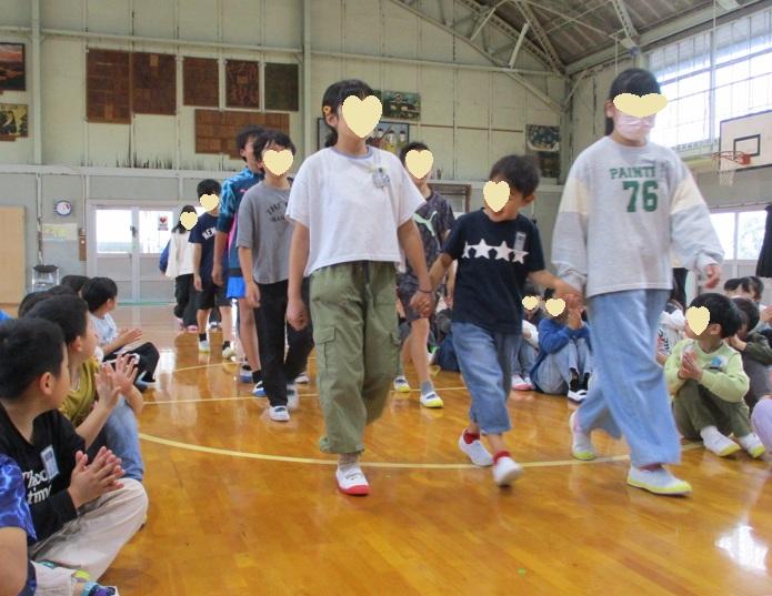 まずは体育館での「歓迎集会」。6年生に優しく手を引かれ、1年生が元気に入場しました。自己紹介タイムでは、8名の1年生が全校児童を前に、自分の名前や好きなことを堂々と発表!その立派な姿に、上級生からも大きな拍手が送られました。