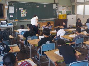 英語で数を数えよう 4年生が、外国語講師と共に英語の学習を行いました。今回は、数に関する学習です。英語で数を数えながら、指定された数を言ったら頭から手を離してタ…