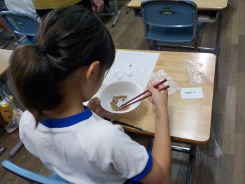 箸使い 2年生が、箸使いの練習を行いました。最初は、持ち方の確認から行い、そしてスポンジを掴む練習を行いました。次に、大豆を掴む練習を行いました。苦…
