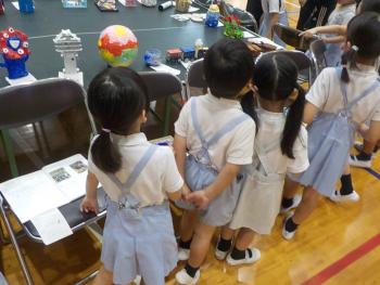 園児の来校 幼稚園児が作品展を見学に来ました。20人ほどの子どもたちが熱心に小学生の作品を見ていました。この中から、来年は10人ほどが入学すると引率の先…