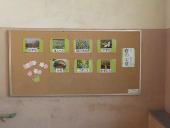 春の七草 階段の踊り場に、春の七草を紹介する掲示物が貼ってありました。子どもたちにも関心もってほしいなと思いながら、写真を撮りました。