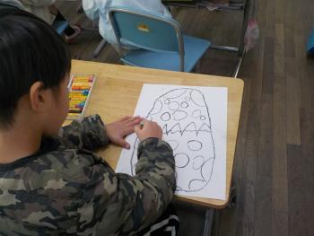 ふしぎなたまご 2年生が、不思議な卵の絵を描いていました。デザインや色を工夫しながら、自分なりの卵を創造して取り組んでいました。