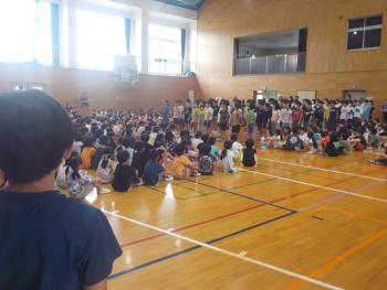 児童集会 体育館で児童集会を行いました。今回は、「猛獣狩り」という室内ゲームでした。集会委員会の進行で全校児童で遊びました。