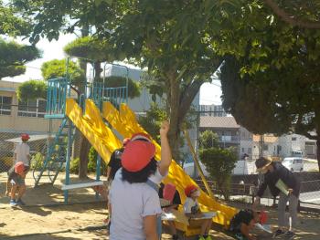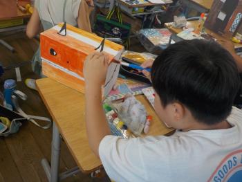 段ボールを使って 4年生が、段ボールを使って作品を作っていました。切ったり貼ったり、色を塗ったりして、すてきな作品が出来上がっていました。