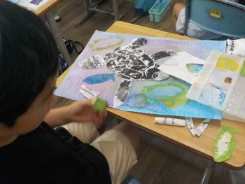 海の絵 2年生が、版画の作品に取り組んでいました。今日は完成に向けて、紙版画の背景を仕上げていました。色を塗ったり、スタンプのように色を付けたりして…