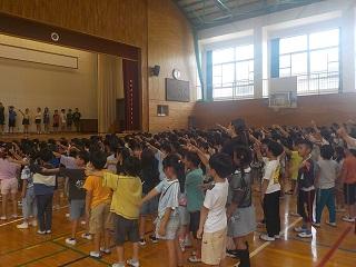 平和集会 6月29日は、佐世保空襲の日です。子どもたちが中心となって、そのことを考える集会を行いました。人権平和委員会の司会進行で始まり、「くすのきは…