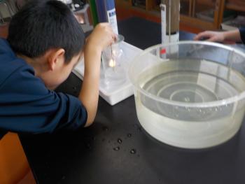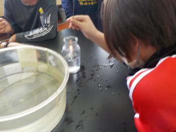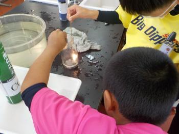 「酸素を入れたガラス容器の中でろうそくの火はどのように燃えるのか」という実験を6年生が行いました。水中の中で酸素ボンベから出てくる酸素をガラス容器に集め、そこにろうそくを入れて確かめました。明るく勢いよく燃える様子を目にして、燃焼に酸素が必要だということが分かりました。