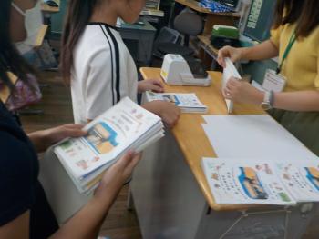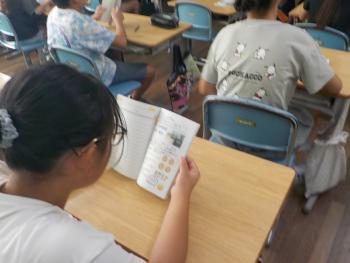 宿泊体験学習のしおり作りに、5年生が取り組んでいました。冊子のようにするために印刷されたプリントを帳合いして、ホッチキスで留めていました。しおりをもとに有意義な体験ができることを願っています。