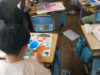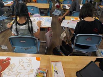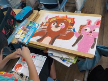 3年生の方も読書感想画に取り組んでいました。はっきりした色遣いで、鮮やかに色を重ねて描いていました。登場人物が生き生きと活躍している絵が多かったです。