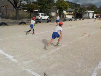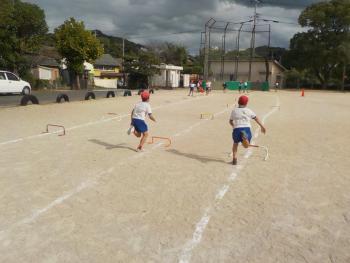 ハードル間が違う3つのレーンで、3年生が障害走に取り組んでいました。自分に合ったレーンを使って、友達と競争していました。