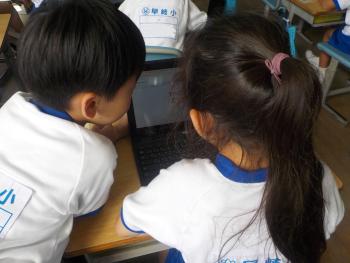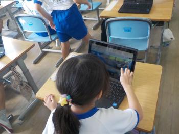 1年生が、タブレットを使って生き物を調べていました。カマキリなど身近な昆虫などを主に調べていました。友達と相談し合いながら取り組んでいました。