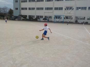 3年生が、フットベースボールをしていました。三角にベースを置き、サッカーボールを蹴る練習をしていました。うまく蹴れるように友達とパス交換を熱心に取り組んでいました。