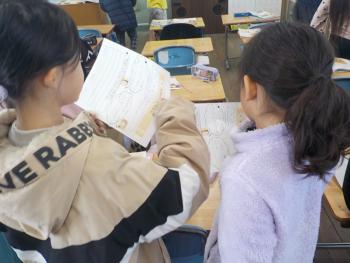 3年生が、ちびまる子ちゃんの「たまちゃん、大すき」を題材にした道徳の学習をしました。子どもたちにも、なじみのある話で、登場人物の思いを素直に声に出していました。友達との意見交換も熱心でした。