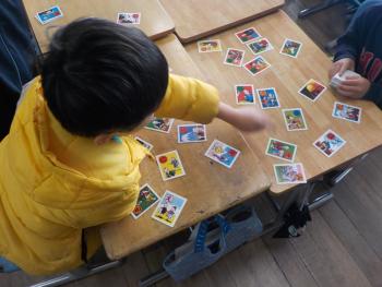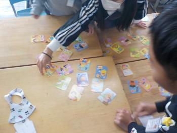 「いぬも歩けば 棒に当たる」のようなことわざを使ったかるたで、3年生がかるた遊びに取り組んでいました。ことわざ辞典を作るためにどのことわざを選ぶか、かるたをしながら決めていました。