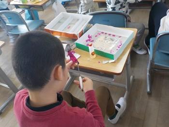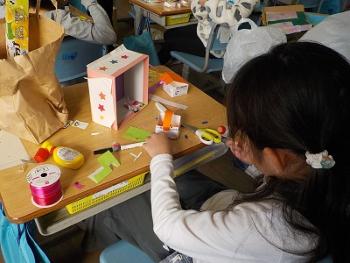 1年生が、図画工作をしていました。大きめの箱の中に小さな箱を敷き詰めたり、飾りを付けたりするなどして、自分なりの大切なボックスを作っていました。みんな黙々と真剣に取り組んでいました。