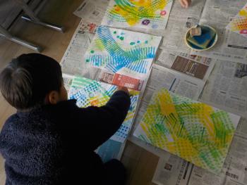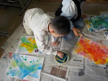 ペッたんぺったんと、1年生がスタンプを押して作品を描いていました。様々な色でスタンプを押したり回したりして、すてきな絵ができていました。