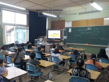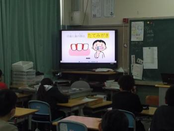 歯の磨き方をお知らせしようと、今回は動画による集会となりました。各教室で視聴しながら、歯ブラシの替え時や縦磨きと横磨きの仕方などを学びました。