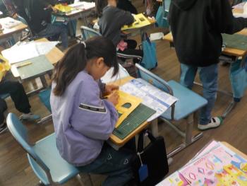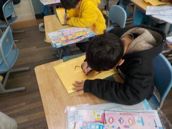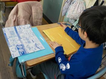 2年生が、図工をしていました。窓がたくさんある四角柱の建物を作る取組です。様々な窓を作るため、カッターで切れ込みを入れなければなりません。みんな慎重にカッターを扱っていました。