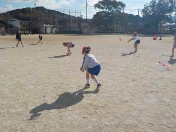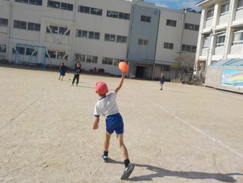4年生が、運動場で体育をしていました。ラグビーボールを使ってパスの練習をしていました。形が普通のボールと違って楕円状なので、投げたり取ったりするのに苦戦していました。