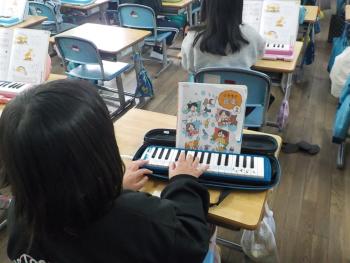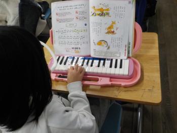 鍵盤ハーモニカの演奏が聴こえてきました。教室をのぞくと、2年生が「小ぎつね」を弾いていました。5指を軽やかに動かしながら、楽しそうに演奏していました。