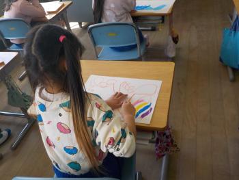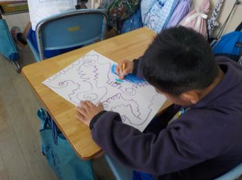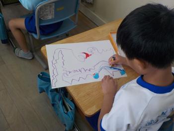 クレパスを使って、1年生が絵を描いていました。今回は「せんのぼうけん」という題材で取り組みました。どんなところを通るのか、どんなものに出会うのか、一人一人想像しながら描いていました。