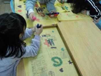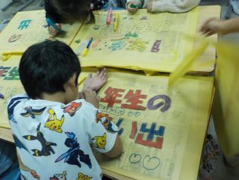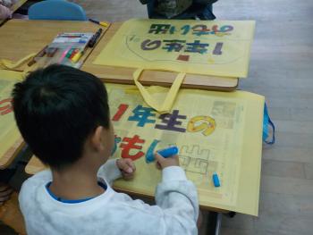 1年間の間に作った作品を、持ち帰る不織布の袋があります。今日は、それに色を塗る活動を1年生が行いました。「1年生の思い出」と太字で書かれた文字に、色ペンで工夫しながら描いていました。