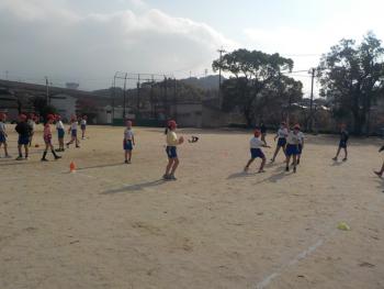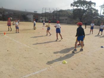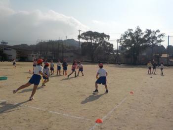 4年生が、運動場でタグラグビーをしていました。腰のあたりにタグを2つ付けてボールを持って逃げたり、そのボールを追いかけたりして楽しそうに活動していました。楕円形のボールを扱うのが難しそうでした。