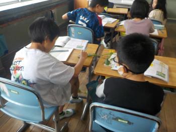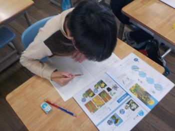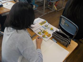 5年生が、理科で菜の花のことを調べていました。教科書の写真と実際の菜の花を見比べながら、ノートにスケッチをしていました。