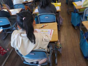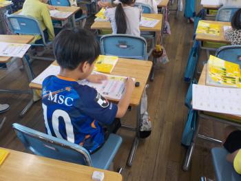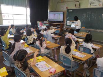 2年生が、漢字の学習をしていました。「南」の書き順を映像を見ながら覚えていました。みんな手を挙げて、1画1画確かめながら書いていました。