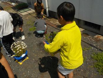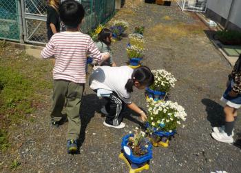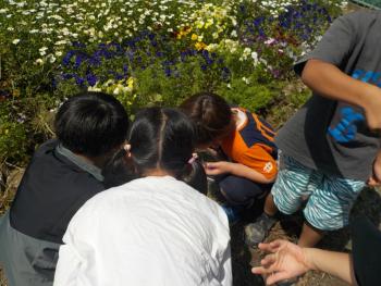 2年生が、生活科でミニトマトを育てるために、自分たちの植木鉢の準備をしていました。昨年植えた花類を整理して、植木鉢をきれいにしようとしていました。ところが、生き物があちらこちらに見られて、そちらが気になっていたようです。