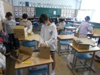 4年生が、ダンボール箱を使って、自分だけの入れ物を作っていました。