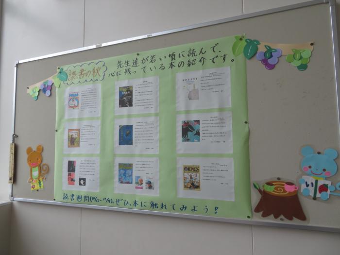 まずは6年生校舎階段の踊り場に掲示してあるのは「読書の秋 先生達が若い頃に読んで、心に残っ…