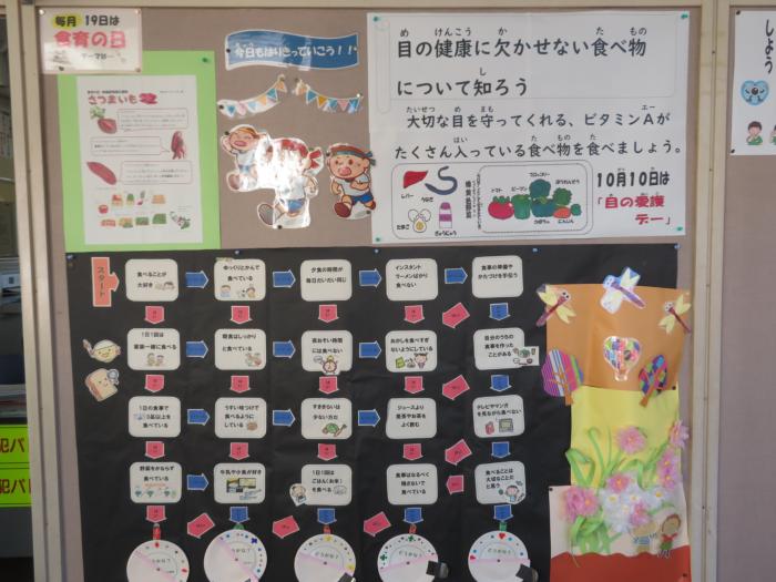 10月上旬ダイジェストNo,5(職員室前掲示物紹介) 掲示物シリーズの最後は、こちら、職員室前の給食にまつわる掲示物。