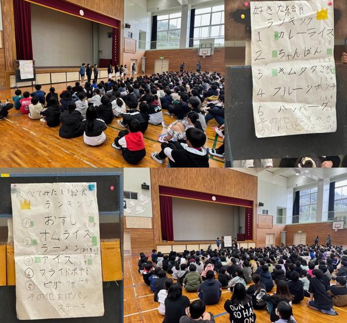 心を込めて! 明日から学校給食週間が始まるのを受け、給食集会を実施しました。給食委員会の給食にまつわる〇×クイズや、好きなメニューや食べてみたいメニューの…