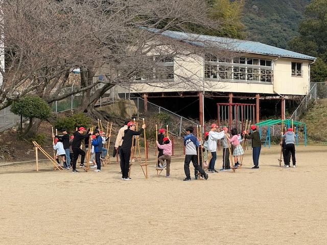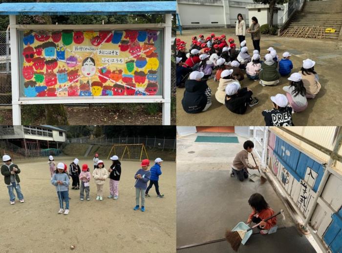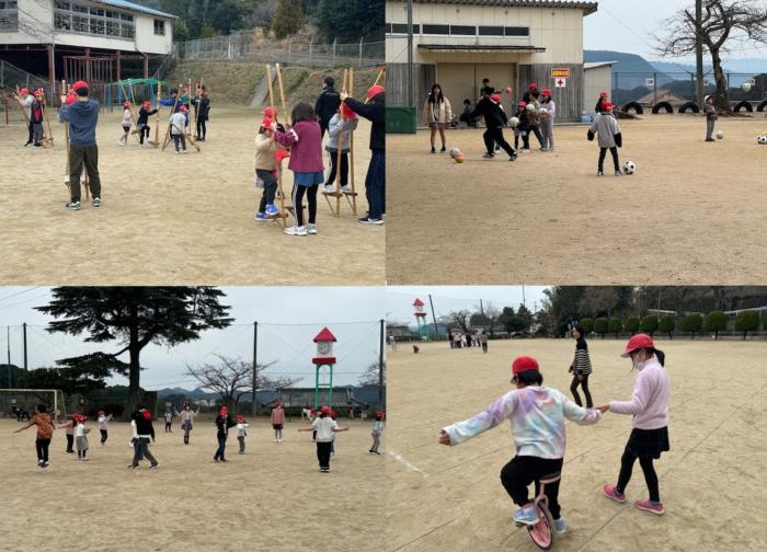 交流遊びをしました! 今日は、昼活動の時間に「交流遊び」をしました。運動場では、1年生と5年生が、「竹馬」「ボール蹴り」「縄跳び」「一輪車」の4グループに分かれて…