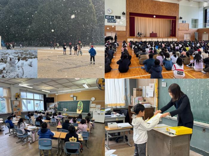 区切りを迎えました! 令和5年度第2学期終業式を行いました。降雪予報が昨日から出ていて、1時間遅れの登校となりましたが、子供たちは運動場にうっすらと積もった雪を嬉…