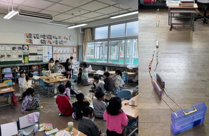 ならべてならべて 1年生が図画工作科「ならべてならべて」の学習をしていました。いろいろな材料を工夫して並べ、楽しい作品を作っていました。工夫とは、「重ねる・つ…