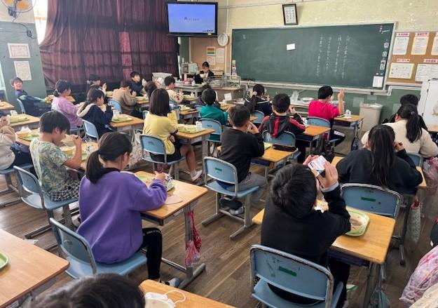 今日もおいしく! 今日の給食メニューは、牛乳、ごはん、もずくのすまし汁、サバの煮付け、ゆかりあえの5品でした。子供たちはおいしそうに食べていました。