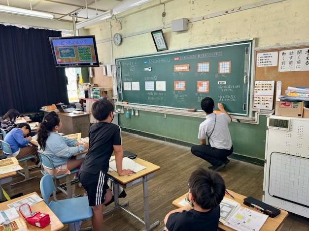 学びを深めて 今日は4年1組で算数の研究授業を行いました。面積の学習を始めていく1時間目でした。周りの長さが同じ花壇の広さを、どうやって比べるかを考える学…