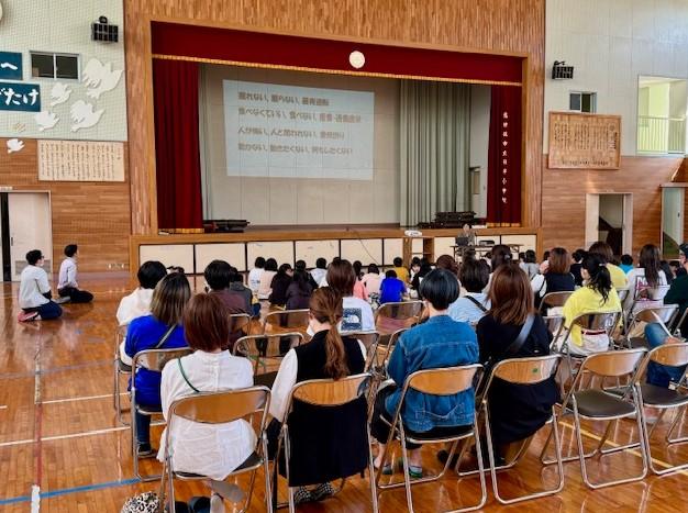 大人が変われば子どもも変わる 今日は、1・2年生合同の授業参観で、長崎県ファミリープログラムを活用したメディア教室を体育館で行いました。