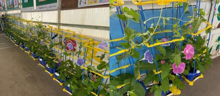 雨の中でも咲いてます 1年生が育てているアサガオが、雨の中でも咲いています。7月に入りましたが、まだまだ梅雨明けは先のようです…。