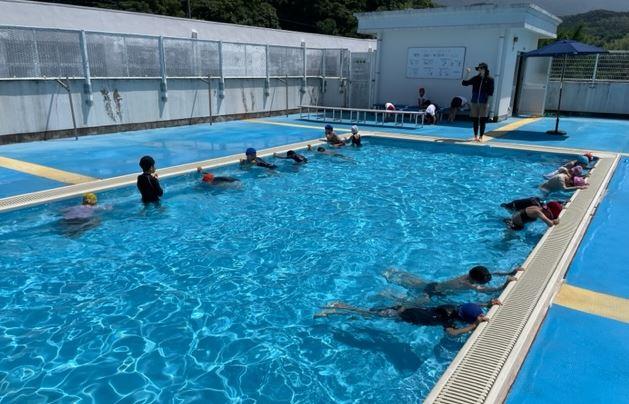 久しぶりの晴れ間に 今日は梅雨も一休み、久しぶりに晴れの一日でした。大変暑い日ではありましたが、青空も下で1年生が水泳の学習を行いました。元気いっぱいに水しぶき…