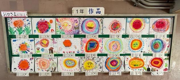 お日さまいっぱい! 職員室から教室へ向かう入口に1年生の掲示板があります。その掲示板には、今色とりどりの楽しいお日さまがいっぱい掲示してあります。1年生が描いた…