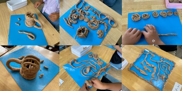 粘土のひもを上手に活かして 1年生が図画工作科「ひもひもねんど」の学習で、ひも状に粘土を伸ばし、つないだり組み合わせたりして、アイディアあふれる素敵な作品を作っていまし…