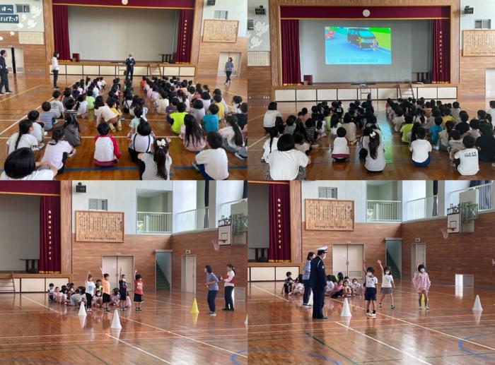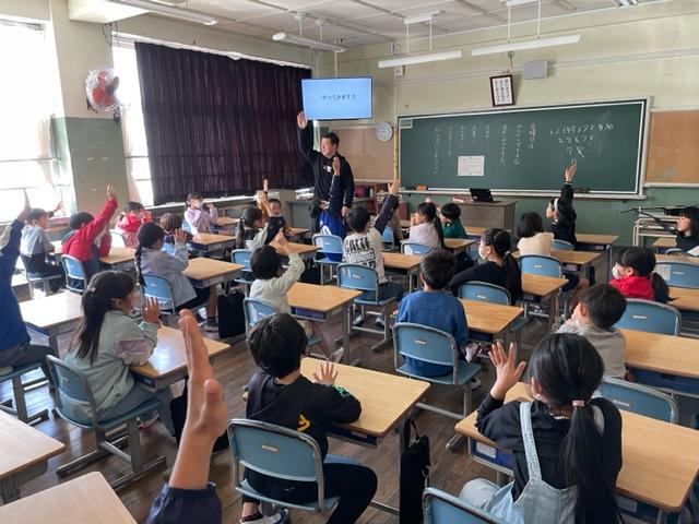 手をしっかりとあげます! 今日、佐世保警察署交通指導係の方にお越しいただき、1・2年生が交通安全教室を体育館で行いました。