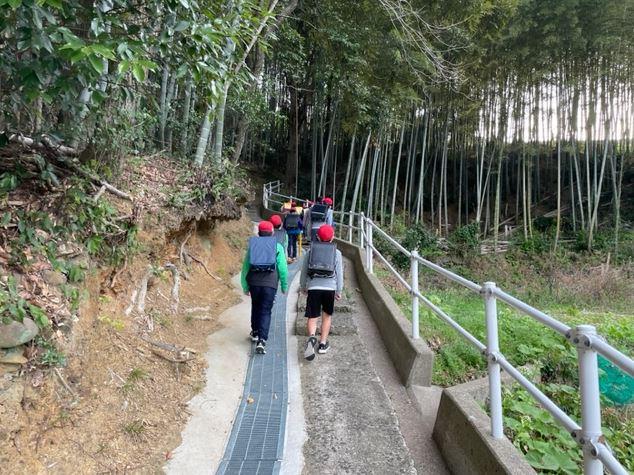 坂道を登って 日宇小学校は烏帽子山系の中ほどに位置し、海抜71.2mの所にあります。ほとんどの児童は坂道を登っての登校となります。季節によっては、汗だくに…