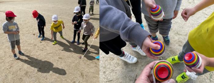 上手く回すのは大変です 1年生が生活科「昔遊び」の学習で、佐世保ゴマと羽根つきをしていました。佐世保ゴマは、どんぐり型のコマで回すのにはコツがいります。私は、子ども…