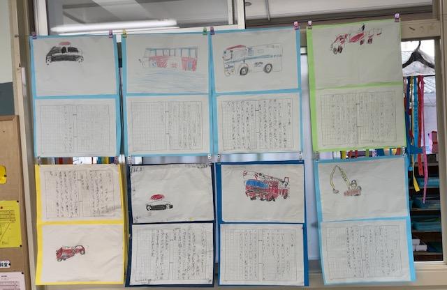 じどう車くらべ 1年生教室にいろいろな自動車のことについてまとめた「じどう車ずかん」が掲示してあります。