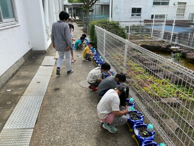 双葉が出ています! 1年生が、生活科の学習でアサガオを育てています。保護者の皆様も小学1年生の頃、育てられたことを覚えていらっしゃると思います。